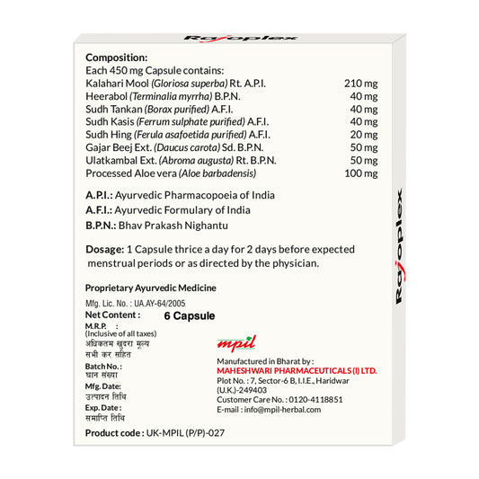 RAJOPLEX CAPSULE Ayurvedic for support women's reproductive 6 Capsules each (PACK OF 3)